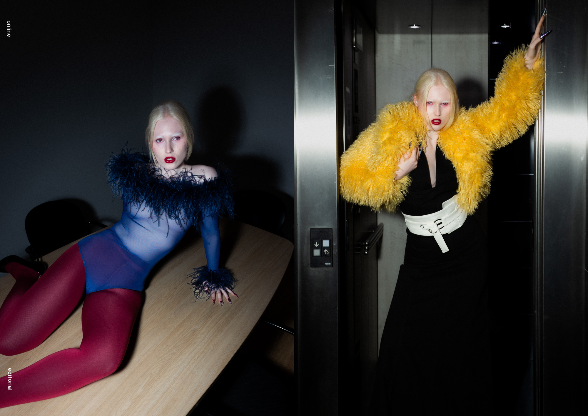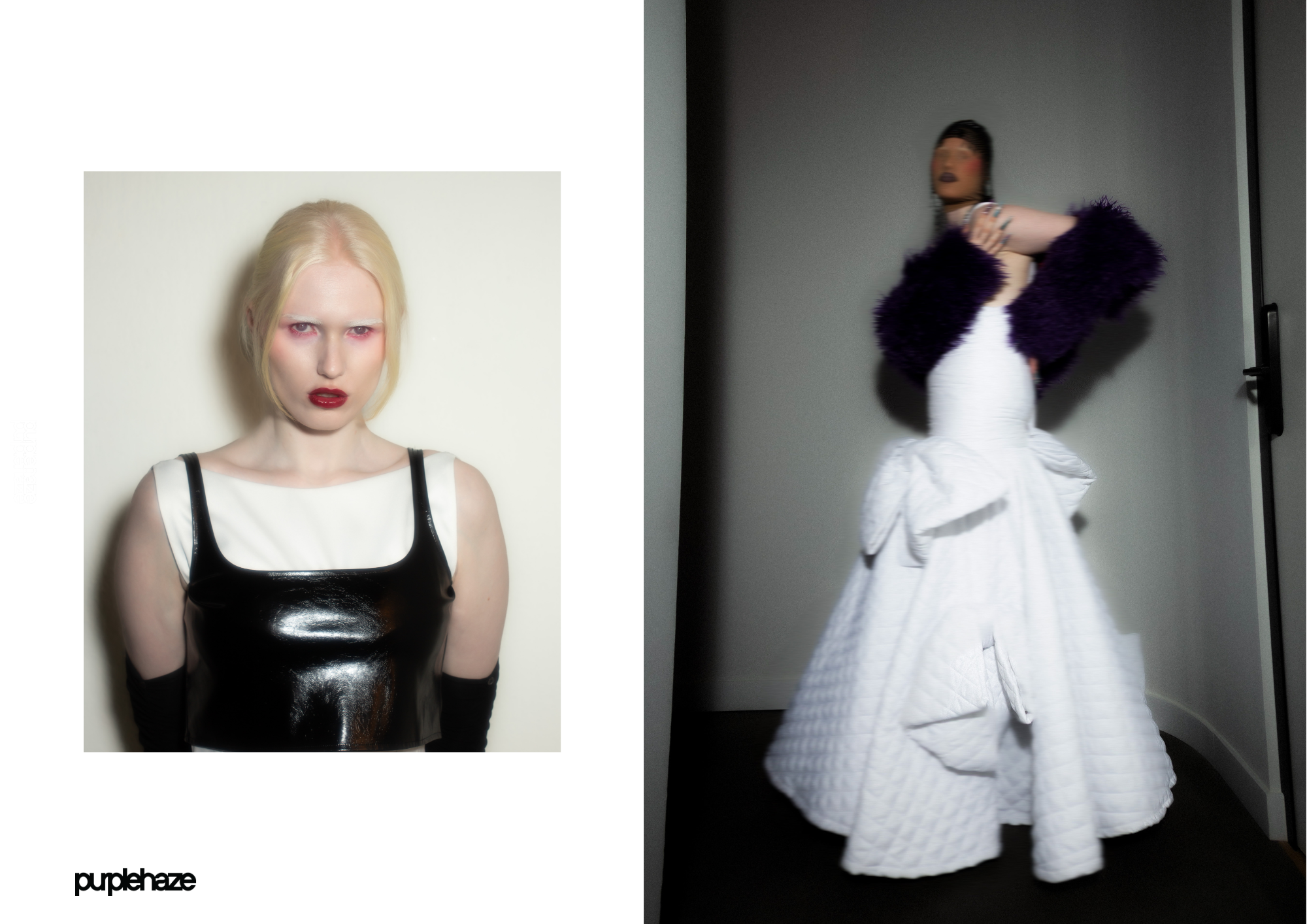 White long dress: Arquímedes Llorens — @arquimedesllorens Black sleeves (feathered body): Pinko — @pinkoofficial Black patent top: A Paper Kid — @apaperkid Black boots: Steve Madden — @stevemadden Jewelry: Vidda — @viddajewelry right | White long dress with bows: Anel Yaos — @anel.yaos Black headpiece: Weili Zheng — @weilizheng Purple coat (size 35): Weili Zheng — @weilizheng Red shoes: Padü — @padu_brand