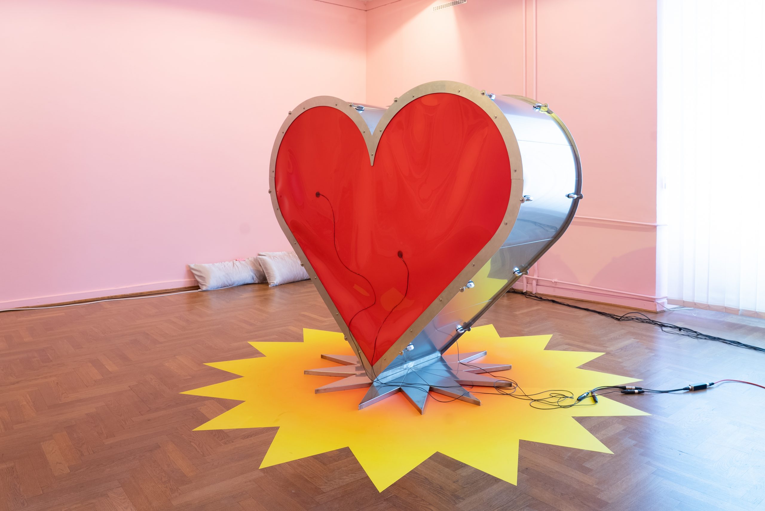 The exhibition brings together three different zones: The first zone, a rest area, features the mentioned composition. An acoustic foam mat and pillows that produce soothing sounds, such as the purring of cats, gentle heartbeats, or the sound of ocean waves, help visitors focus their attention fully on the sounds surrounding them.