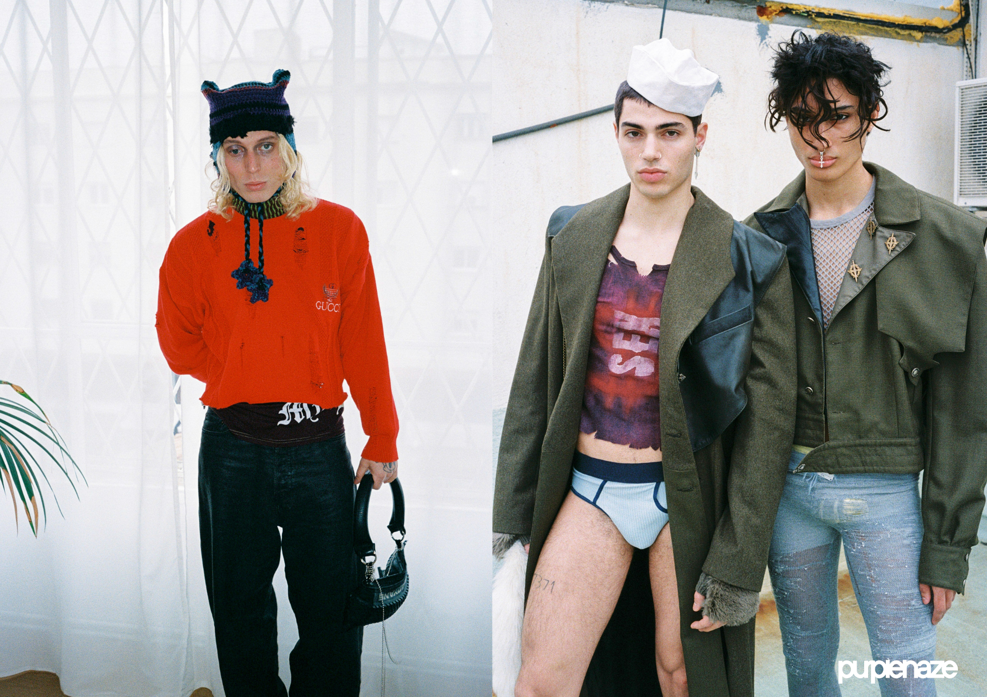 Left | Gucci – Jumper Right | Both models wear Lanis gallery army – Wool coats Rubén wears infernal baddies – SEX T-shirt Victor Von Schwar – Men’s underwear Marlon wears infernal baddies – Tights