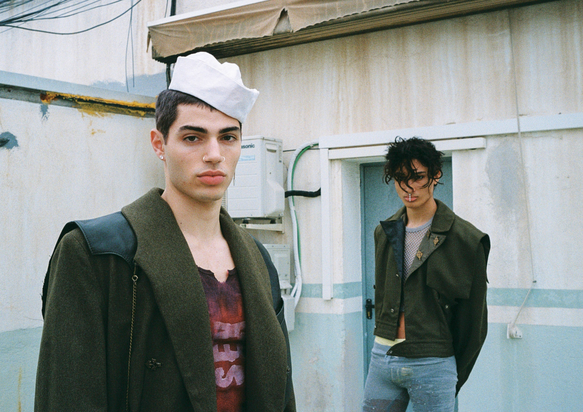 Both models wear Lanis gallery army – Wool coats Rubén wears infernal baddies – SEX T-shirt Victor Von Schwar – Men’s underwear Marlon wears infernal baddies – Tights