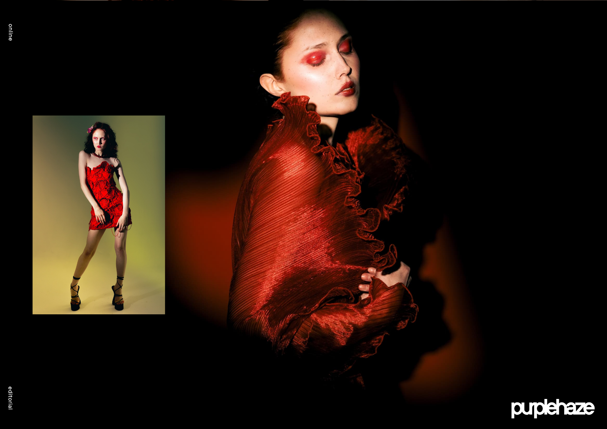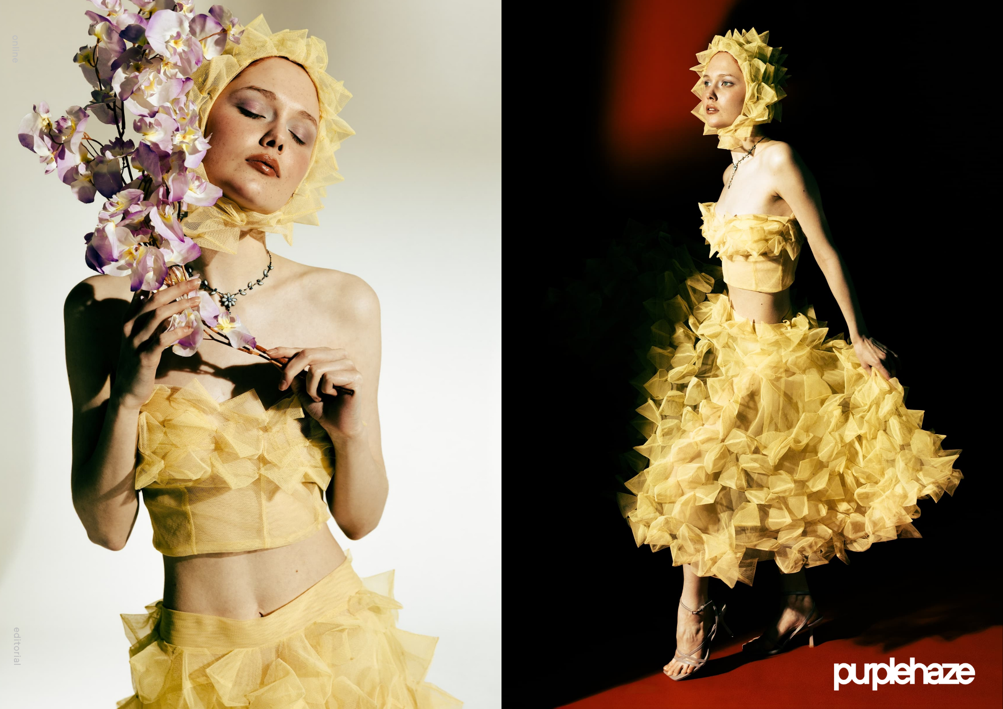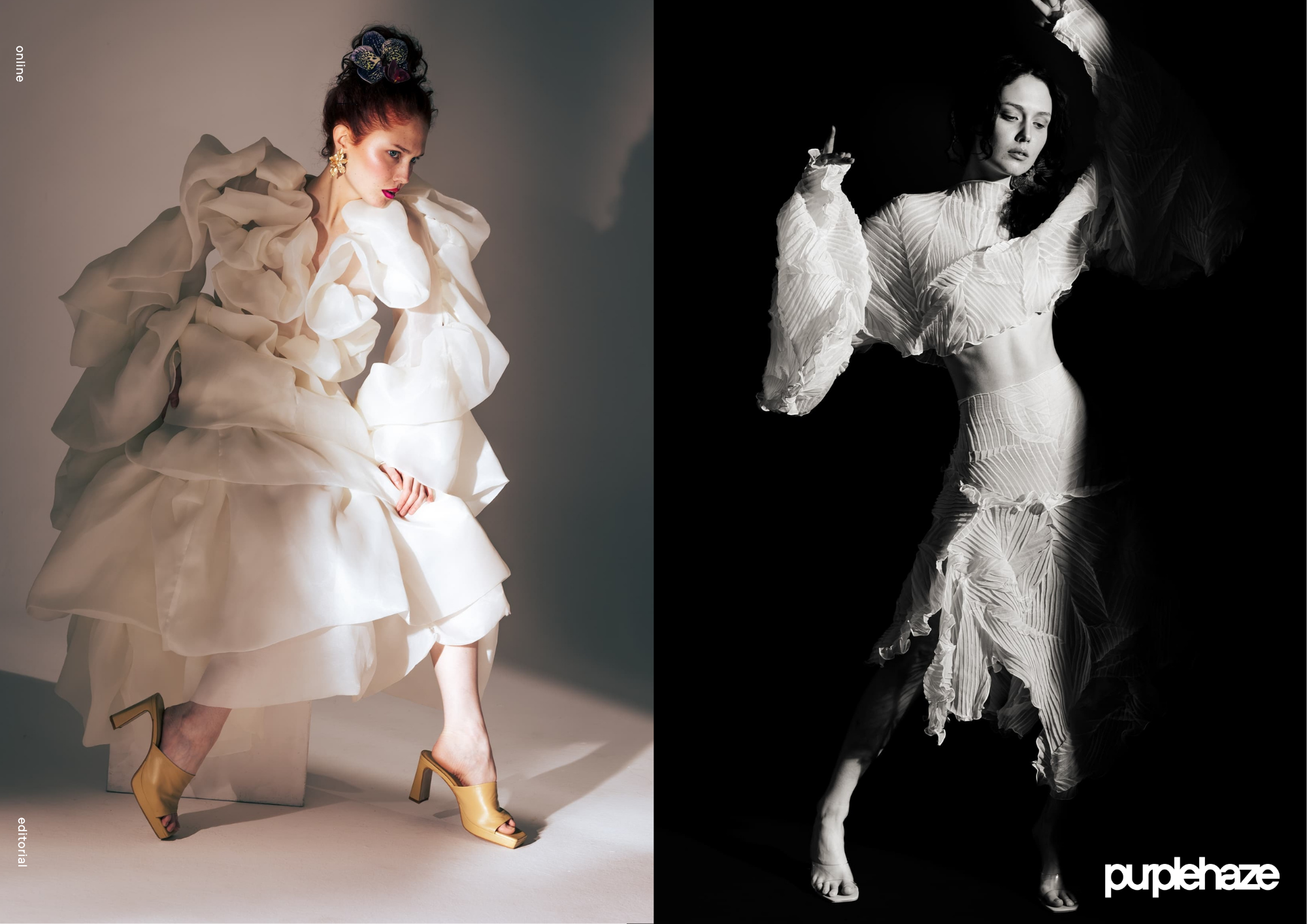 Top, skirt, headwear : Magdalena Wilk-Dryło Necklace: wardrobe stylist’s own RIGHT Top, skirt, headwear: Magdalena Wilk-Dryło Necklace: wardrobe stylist’s own Shoes: H&M